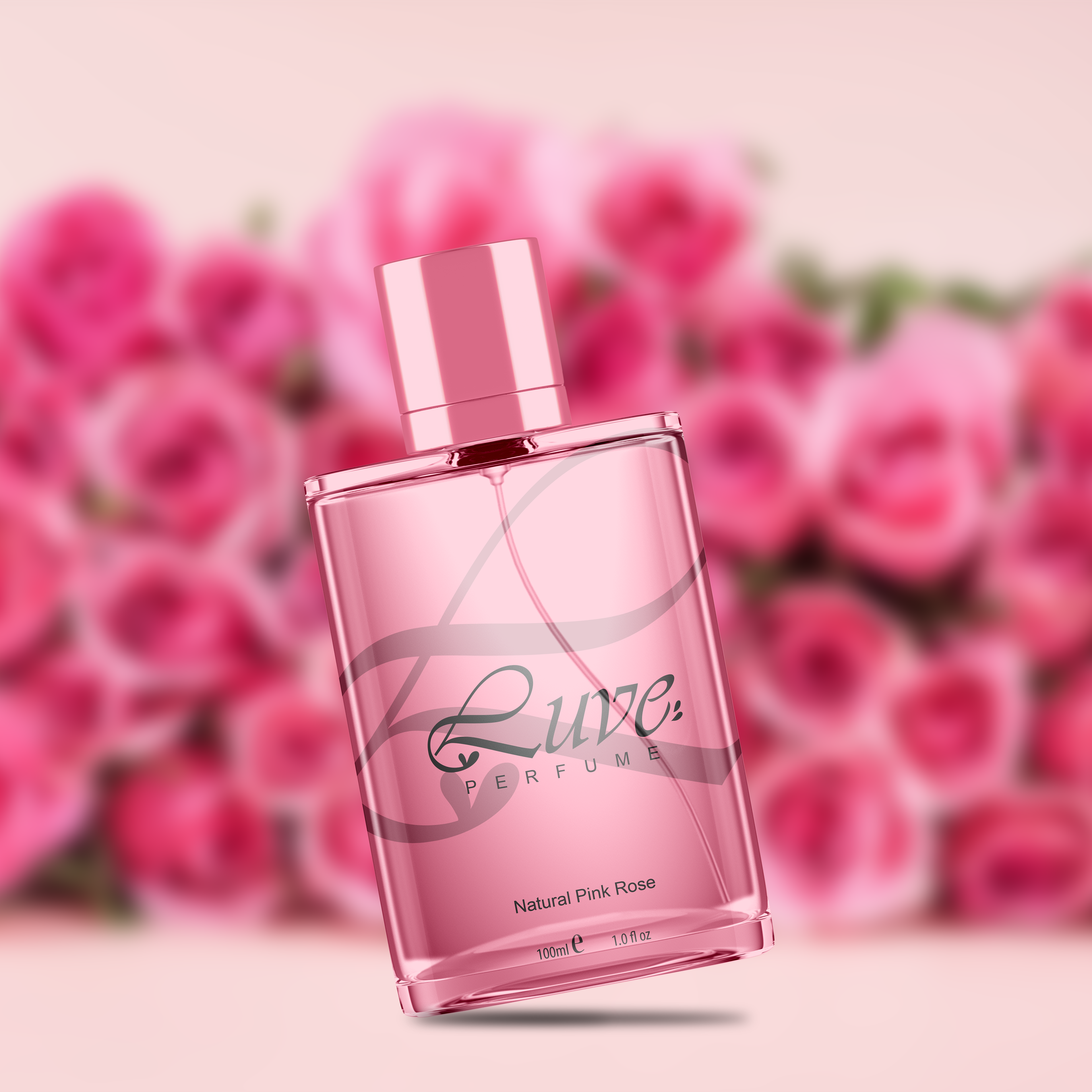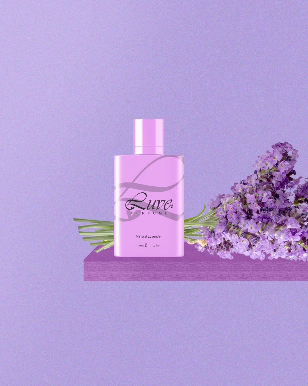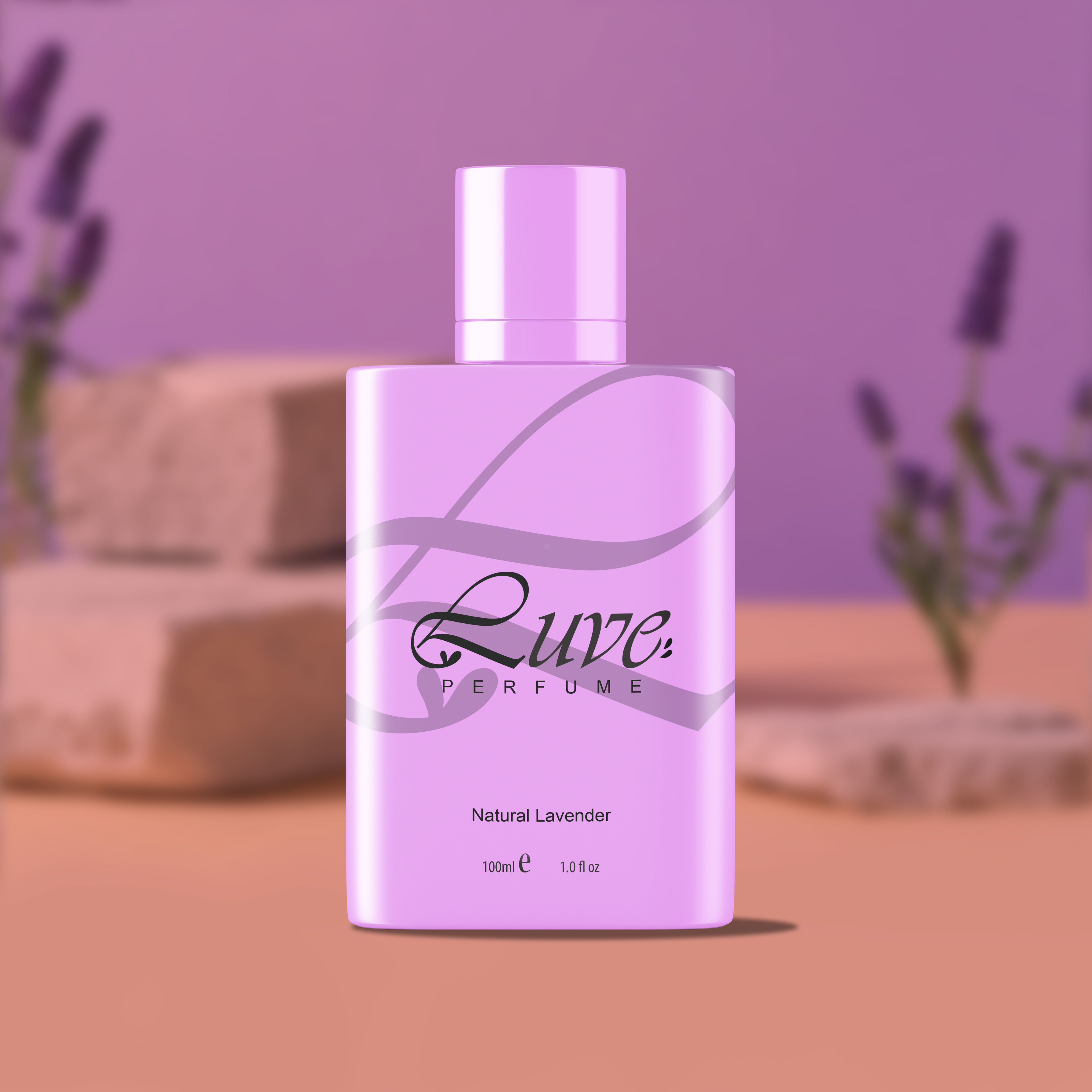 Luve perfume is made from all-natural, organic ingredients. The fragrance features natural scents like lavender and roses, and the packaging design aligns with this aromatic palette. The branding aims for simplicity and elegance, which is reflected in both the logo design and the perfume bottle.